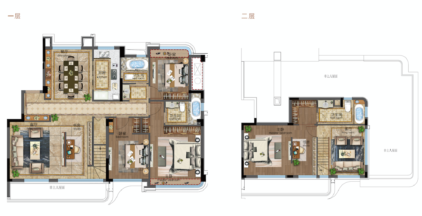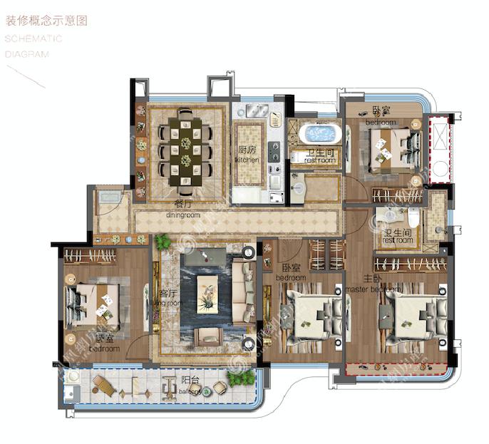 1、整体空间大气方正,四开间朝南,南向双阳台,阔绰尺度更懂品质生活;2、独立餐厅与厨房近距离排布,日常烹饪或宴请宾朋,优雅自得;3、客厅南向连接宽景阳台,次卧亦与南向阳台连通,居家生活风景相伴;4、主卧套房设计,带独立卫生间,宽景飘窗饱览园区盛景。