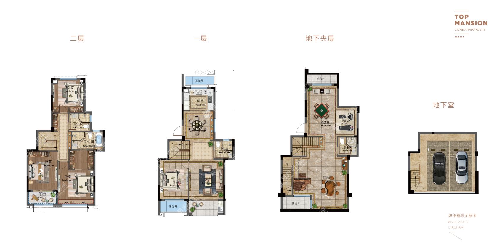 三层空间带朗阔地下室,守护层峰精致人生;一层厨房餐厅相连,客厅书房从容布局,外接阳台视野开阔;二层空间静态分布,双卧朝南,主卧豪华套房带独立卫浴;地下夹层私人订制,集观影、运动、休闲享受于一体;地下室面宽约7.3米,可停放两辆爱车,归家有位。