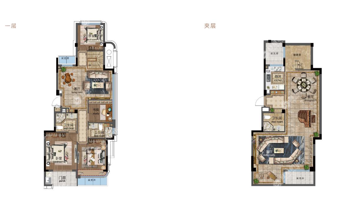 两层布局,四房舒居,动静分明;夹层厨房与餐厅紧密相连,动线合理,美味与爱并存;餐客厅一体化,于此派对赏玩,奢享格调生活;一层双卧朝南,配置飘窗或阳台,揽美景入怀;总体三卫人性化设计,更享舒适健康。